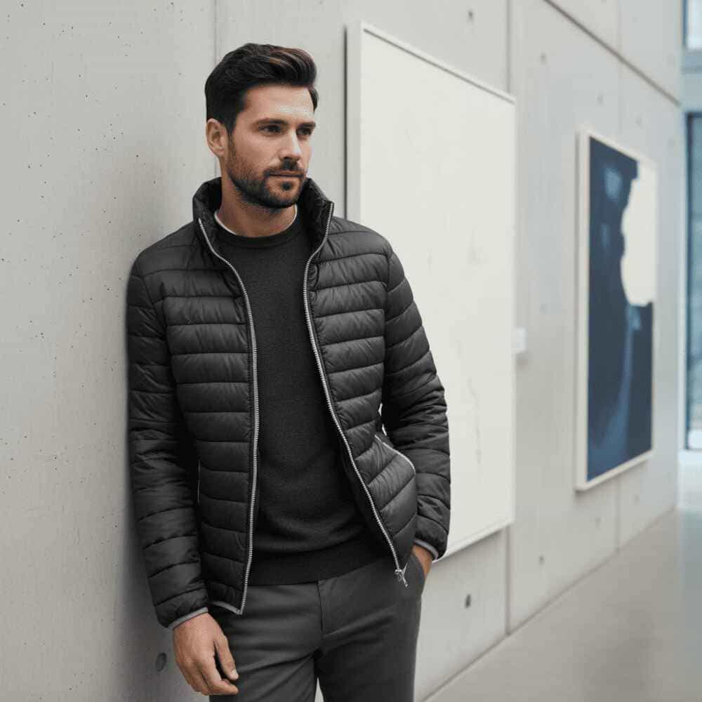 Ένα μοντέρνο και πρακτικό ανδρικό μπουφάν puffer, αδιάβροχο και αντιανεμικό, με κανονική εφαρμογή και φερμουάρ σε χρώμα αντίθεσης.