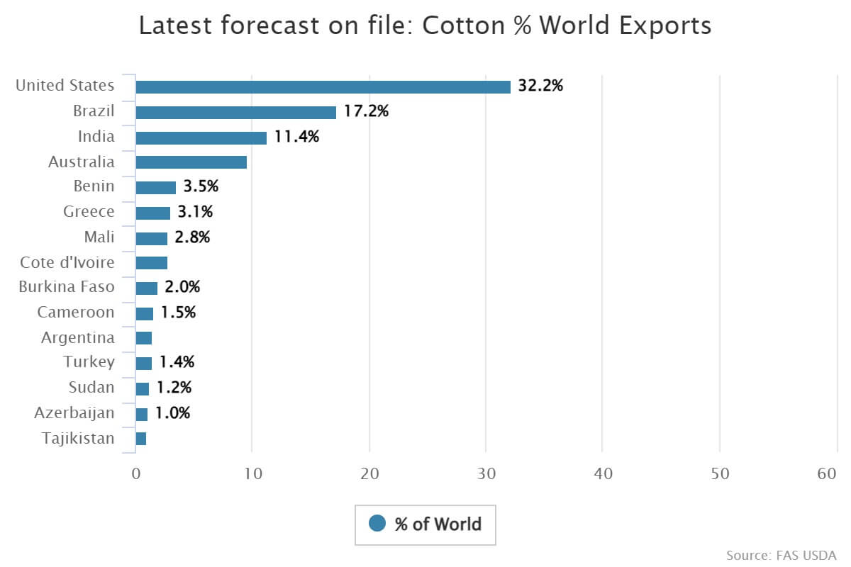 Οι παραγωγοί της Νότιας Αμερικής και της Αφρικής παράγουν σημαντική ποσότητα βαμβακιού όπου μεγάλο μέρος του που καλλιεργείται σε οικογενειακές φάρμες. Η Βραζιλία και το Πακιστάν συμπληρώνουν τις πέντε κορυφαίες χώρες παραγωγής βαμβακιού και η Βραζιλία συνεργάζεται για την προώθηση της βιώσιμης ανάπτυξης του βαμβακιού στην ευρύτερη περιοχή εδώ και μια δεκαετία με τον ΟΗΕ και επτά γειτονικές χώρες. Μέσω του έργου +Cotton, αυτοί οι εταίροι εργάζονται για πιο βιώσιμα και χωρίς αποκλεισμούς συστήματα παραγωγής, καθώς και για δίκαιο εμπόριο. Ακόμη, να σημειώσουμε ότι η Ελλάδα βρίσκεται στην 6η θέση παγκοσμίως στις εξαγωγές βάμβακος.